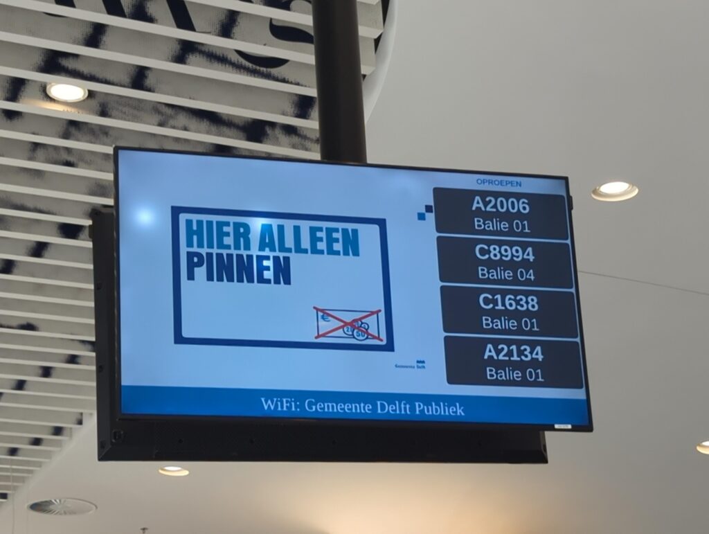 Na vraag bij de balie leert trouwens dat bovenstaande PIN only foto een “foutje” is, je blijkt wel gewoon contant te kunnen betalen. Mocht je dit weer zien op de beeldschermen bij de gemeente dan horen wij het graag.